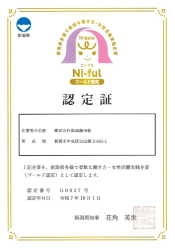 新潟県 様より、令和7年10月から認定が始まった「新潟県多様で柔軟な働き方・女性活躍実践企業認定制度」(通称:Ni-ful(ニーフル))の「ゴールド認定企業」として認定をいただきました。