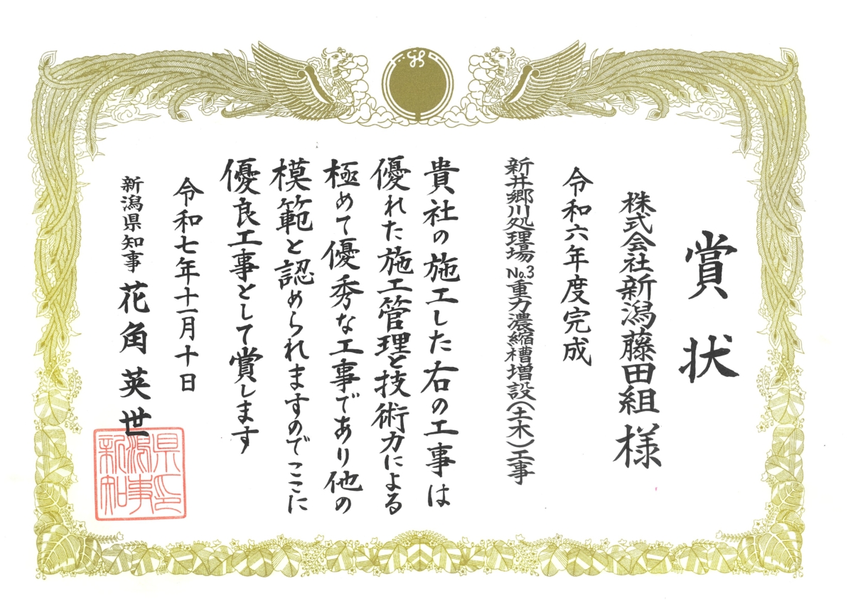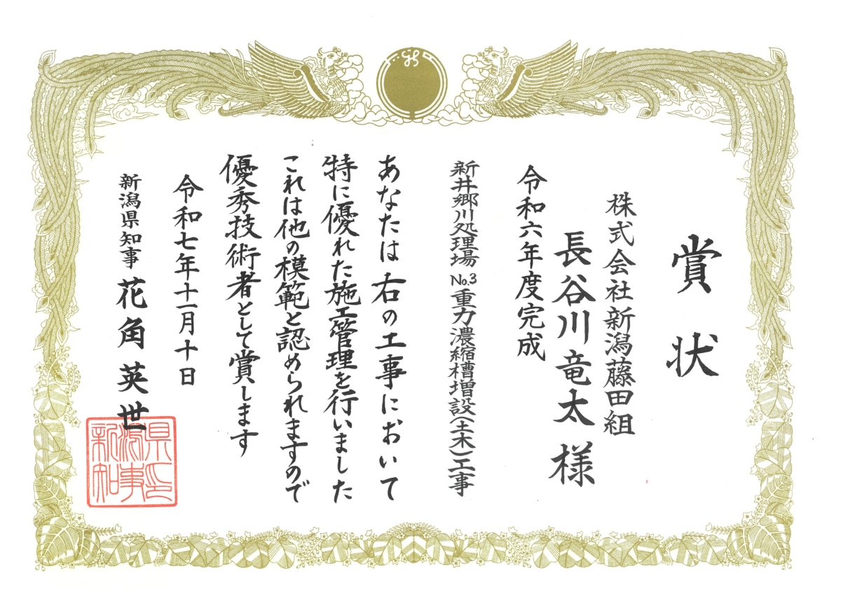 11月10日(月)に新潟県知事様より、「新井郷川処理場NO.3重力濃縮槽増設(土木)工事」において、優良工事ならびに優秀技術者表彰をいただきました。
