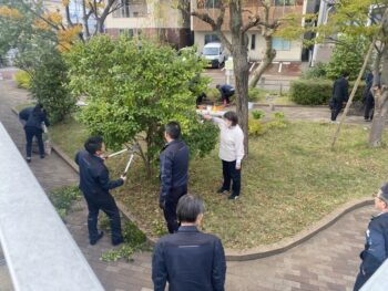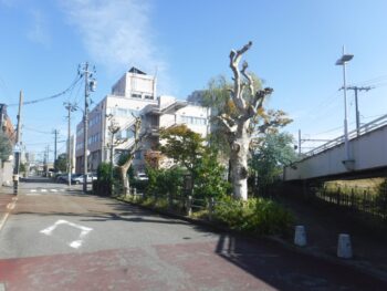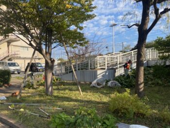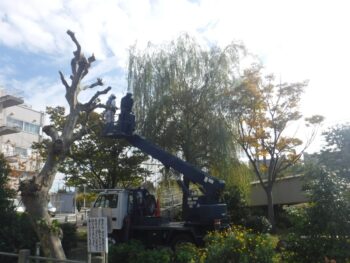 11月8日(土)に今年最後のアダプト活動を実施しましたが、それに先立って6日(木)に高所作業車を用いて道路側のプラタナス(モミジバスズカケノキ)の伐採作業を行いました。