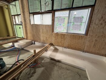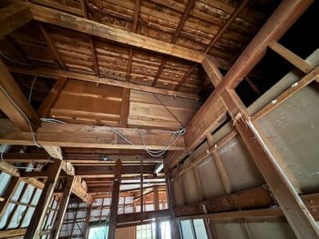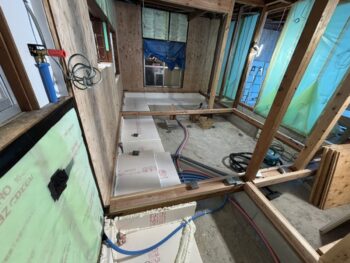 写真は、断熱改修中の様子。壁の中には断熱材が充填され、床にも断熱ボードを敷き込んでいます。