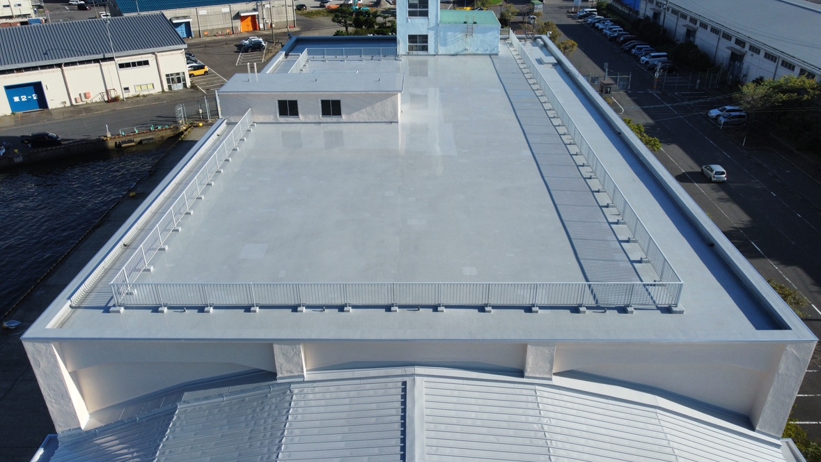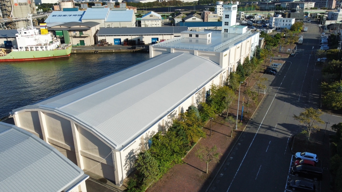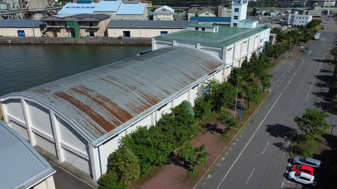 【建築事業部】新潟港(西港区)中1号上屋改修建築工事 お知らせ, 事業施設施工事例, 建築, 建築事例, 施工事例 | 2026.03.02 規模・構造 鉄筋コンクリート造 3階建て 工事概要 外壁改修・屋上防水改修・金属屋根塗装改修、他 竣工 令和7年10月 Tweet